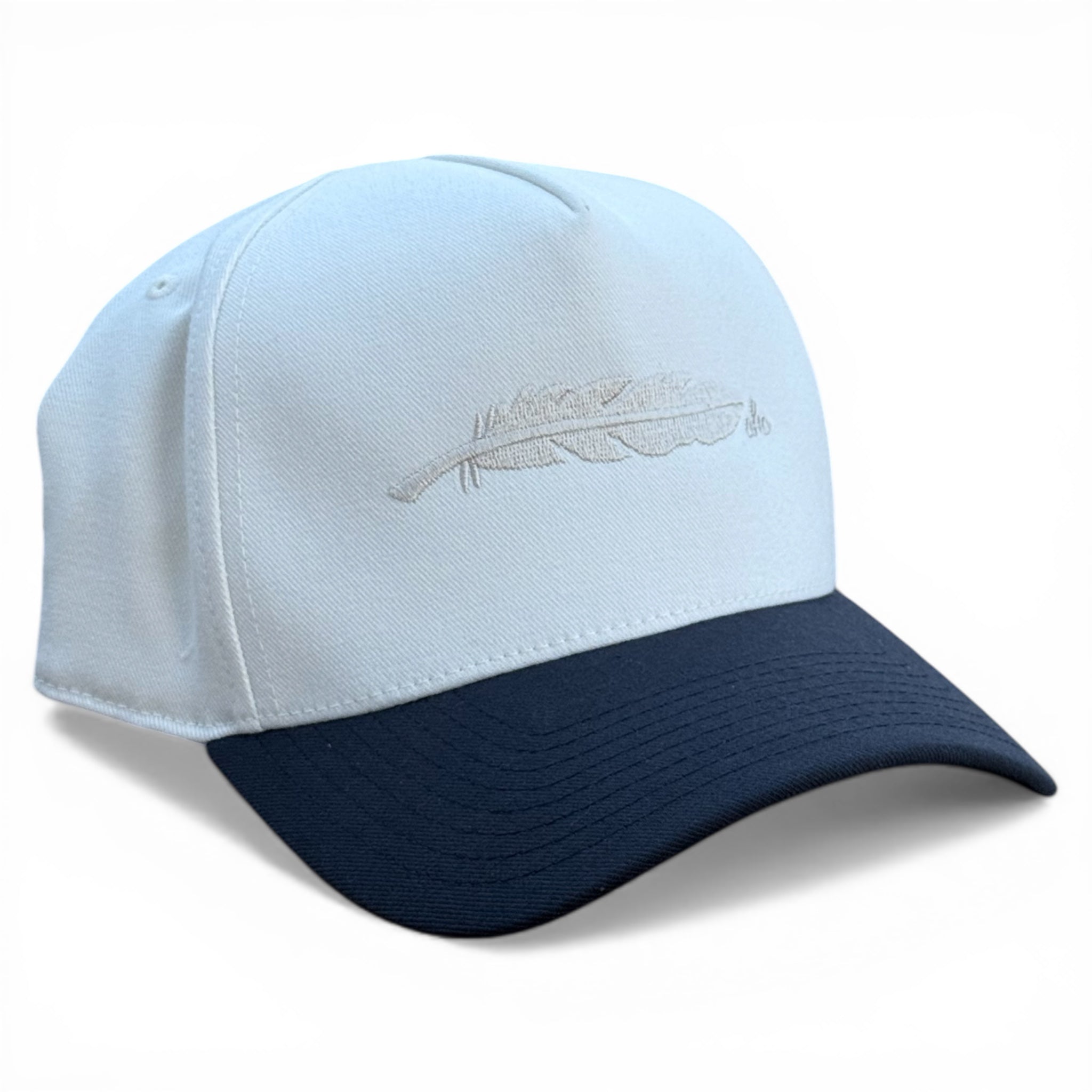 Vintage white crown, navy brim, and a tonal embroidered AHC feather. The Harbor is a structured cotton snapback built for big heads — fits up to a size 8 with no pinching, no headaches. Classic two-tone that holds its shape wash after wash.
