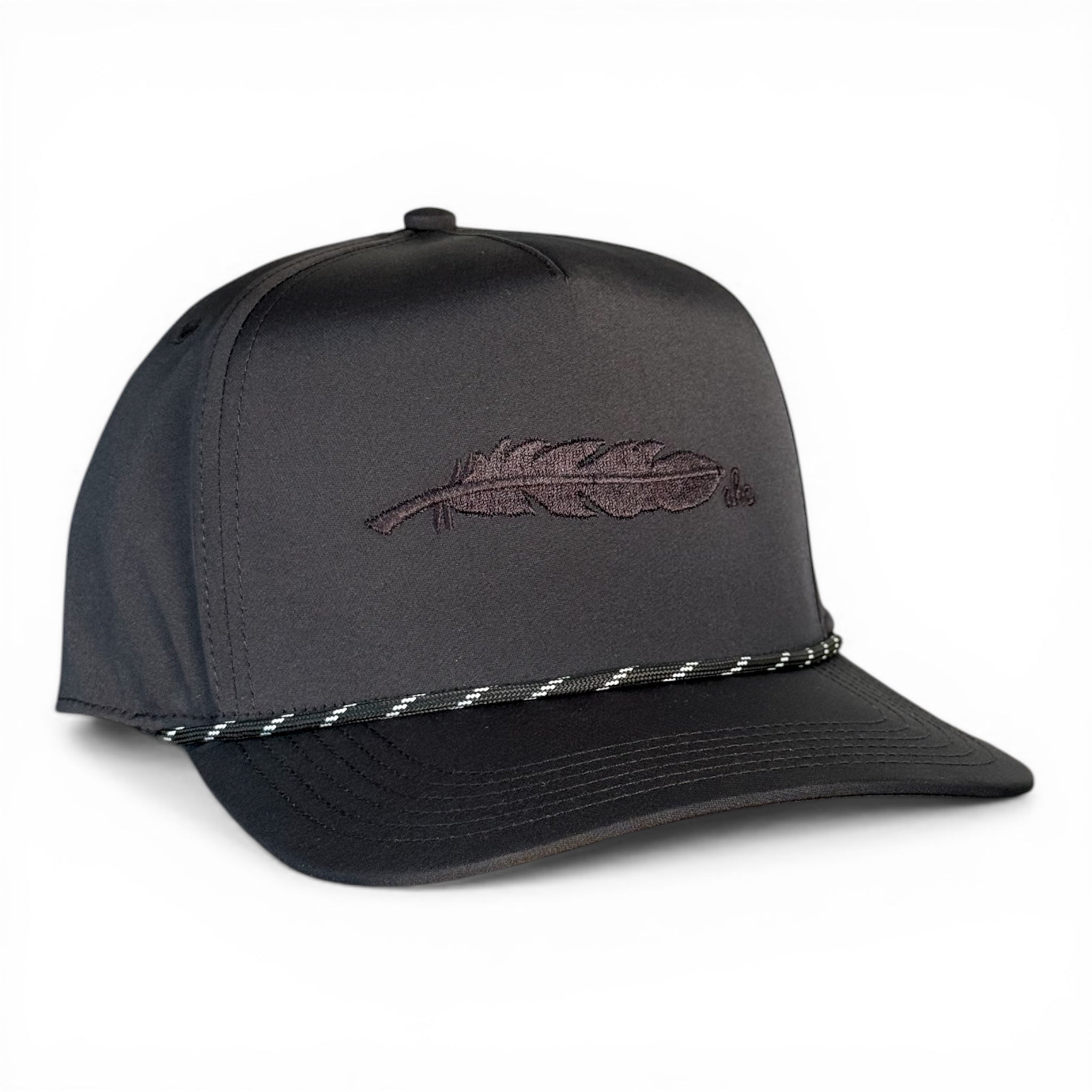 All black everything. The Blackout is a murdered-out rope snapback with a tonal black-on-black embroidered AHC feather and a braided black-and-white rope across the brim. Built for big heads — fits up to a size 8 with no pinching, no headaches.
